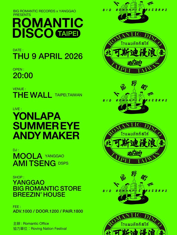 ROMANTIC DISCO 浪漫迪斯可 LIVE 2026/04/09(木) 台北 THE WALL 地図を表示 OPEN &START 20:00 LIVE: YONLAPA / Summer Eye / Andy Maker DJ: MOOLA (YANGGAO) / Ami Tseng TICKET: Advance NT$1000 / Advance (2 tickets) NT$1800 / Door NT$1200 TICKET & INFO URLをコピーする 報告する