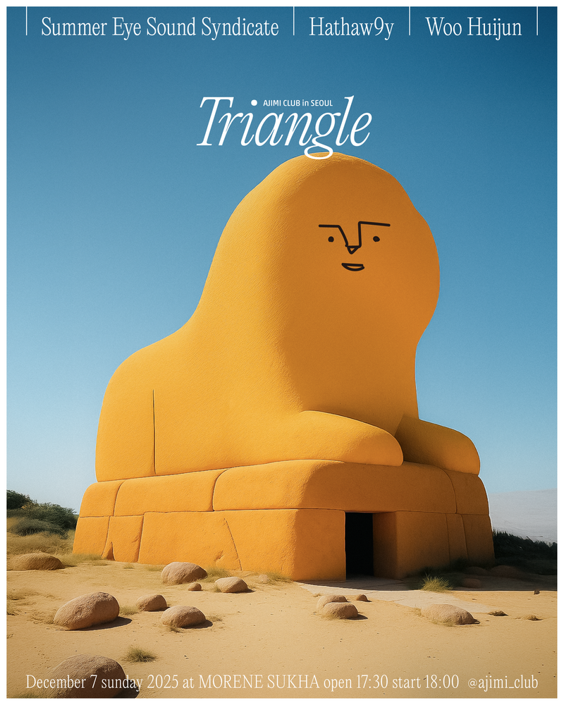 AJIMI CLUB in Seoul「Triangle」 LIVE 2025/12/07(日) 韓国 Seoul morene sukha(極楽) 모래내 극락 地図を表示 OPEN 17:30 / START 18:00 LIVE: Summer Eye Sound Syndicate, Hathaw9y, Woo Huijun TICKET: ADV ₩50,000 / DOOR ₩60,000 TICKET(for Japanese) & INFO URLをコピーする 報告する